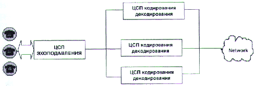 Предыдущее обсуждение предполагает, что каждый ЦСП в системе выполняет однотипные операции. Такой подход имеет как достоинства, так и недостатки. Главным преимуществом является простота проектирования и контроля. Поскольку ЦСП в системе играют одинаковую роль, каждый из них подключается аналогично и загружается теми же программами, при этом системному контроллеру не приходится делать различий между заданиями для различных ЦСП. Главным недостатком такого подхода является большой объем программного обеспечения, а следовательно, высокие требования к памяти ЦСП. Так как каждый ЦСП выполняет голосовое кодирование, декодирование, эхоподавление и др., программы каждого из них занимают много места во внутренней памяти. Альтернативной является такая конфигурация системы, когда выполняемые функции перераспределены между входящими в нее ЦСП. На рис.3 показана возможная конфигурация такой распределенной системы.