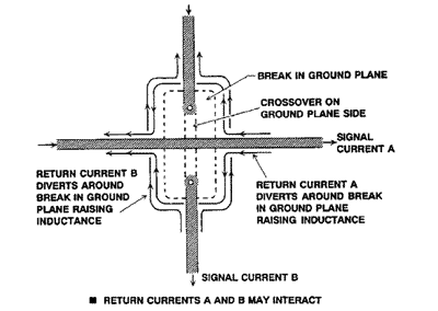 Следует стремиться выполнить разводку чувствительных аналоговых цепей в одном слое (со стороны установки компонентов) и избегать пересечений проводников, так как нарушение целостности заземляющего слоя вызывает увеличение его индуктивности и, следовательно, возрастает степень взаимного влияния возвратных токов (рис. 9).