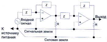 Поэтому необходимо использовать несколько цепей заземления, соединенных в одной точке. Причем традиционного деления на аналоговую и цифровую земли может оказаться недостаточно. На рис. 5 представлена схема заземления для двух аналоговых земель, причем одна служит землей для слабого входного сигнала, а другая — для мощного выходного.
