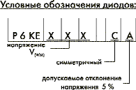 Диоды серии P6КЕ6,8–P6КЕ440СА выпускаются в симметричном и несимметричном исполнении. В обозначении симметричного диода добавляется суффикс С или СА.