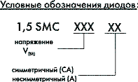 Диоды серии 1,5SMC выпускаются в симметричном и несимметричном исполнении. В обозначении симметричного диода добавляется суффикс СА. Например, 1,5SMC10CA. В несимметричных диодах для обозначения катода на корпусе наносится специальная полоса (см. габаритный чертеж 1,5SMC).