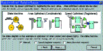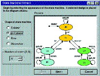 Мастер цифровых автоматов позволяет в диалоговом режиме автоматически определить параметры цифрового автомата. Он также дает возможность быстро создавать базовые автоматы (state machines), которые затем можно включить в более крупный проект или использовать самостоятельно. Используя диалоговые панели, мастера определяют тип автомата, режим сброса и типы переходов. После определения автомата закрывают окно мастера и помещают курсор в желаемое место расположения диаграммы переходов.