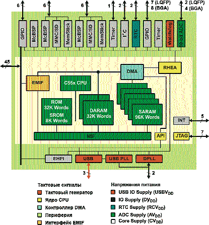 Несколько слов о внутренней периферии. Кроме обычного для семейств скоростных ЦСП блока тактового генератора, TMS320VC5509 содержит отдельный блок часов реального времени со своим входом для подключения кварца, своей линией тактовой частоты и своим участком питания. Еще одна особенность ядра С55хх и ЦСП, построенных на его базе: каждый блок ядра ЦСП и периферии может иметь свою линию тактирования и, соответственно, может тактироваться своей частотой. Из рисунка видно, что ЦСП разделен на участки со своим напряжением питания и тактовыми линиями. То есть, возможна ситуация, когда из всего ЦСП будут активны только часы реального времени, и при этом устройство будет иметь очень малое, сравнимое с микроконтроллером потребление. Вообще, система отключения или перевода в режим ожидания отдельных модулей позволяет достичь малого потребления даже при решении сложных задач за счет того, что не используемые в данный момент блоки отключаются и распределение потребляемой мощности оптимизируется под выполняемый алгоритм. Отметим также наличие двух 16-разрядных таймеров общего назначения и отдельный сторожевой Watchdog таймер.