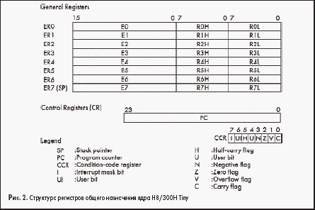 - Вся серия H8, включая Н8/300Н Tiny, обладает общим ядром и регистрами общего назначения (РОН), позволяющими эффективно выполнять программы, написанные на С.