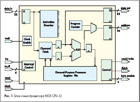 Процессор Nios, является RISC-процессором с конвейерной обработкой команд, большинство команд которого выполняется в единственном цикле синхрочастоты [1–2, 6]. Система команд Nios ориентирована на встроенные прикладные программы. Nios CPU в вариантах применения на 16 бит и 32 бит, имеет размеры слова соответственно 16 бит и 32 бит.