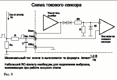 Выражение справедливо для R T >5 кОм. Подключение времязадающей RC-цепочки и графики зависимости рабочего цикла от емкости конденсатора и частоты от сопротивления резистора и емкости конденсатора показаны на рис.7. На кристалле имеется усилитель ошибки (рис.8), неинвертирующий вход которого «сидит » на внутреннем источнике напряжения 2,5 В, а инвертирующий вход имеет собственный вывод, служащий входом обратной связи. Выход этого усилителя соединяется с выводом 1 и через цепочку сдвига уровня с инвертирующим входом компаратора ограничения тока. Неинвертирующий вход компаратора ограничения тока выведен на отдельный вывод и служит для подключения к внешнему токоизмерительному резистору (рис.9), через который течет ток нагрузки. Номинал этого резистора и, соответственно, падение напряжения на нем и определяет предельный ток, текущий через мощный внешний ключ, которым управляет контроллер. Другие устройства на кристалле — это RS-защелка и гика. Вместе они обеспечивают модуляцию ширины импульса в зависимости от напряжения усилителя ошибки и сигнала токового компаратора. Кроме того, в микросхемах UC Х844/5 присутствует Т-триггер, который обеспечивает максимальную скважность 50%.