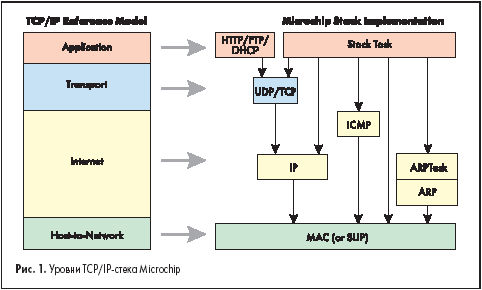 последовательности IP-пакетов (то есть реально проверить работу TCP/IP), но в небольшой локальной сети, где вероятность потери пакета и нарушения порядка следования мала, стек Microchip успешно поддерживал несколько соединений. Так как в TCP существует функция таймаута, то требуется поддержка часов — для этого есть специальная функция учета времени. Более простой в реализации протокол UDP обеспечивает передачу отдельных пакетов. При этом упрощением UDP данного стека является нулевая контрольная сумма, что перекладывает задачу сохранения целостности информации на приложение.