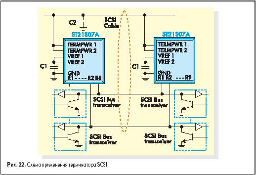 SCSI-2 и SCSI-3 — стандарты высокоскоростного параллельного интерфейса, разработанные ANSI для подключения к компьютеру периферийных устройств, других компьютеров или ЛВС. Рекомендуется использование активных согласующих устройств на каждом конце кабельного сегмента в SCSI-системе, включающей несимметричные драйверы и приемники. Для обеспечения такого согласования компания ST предлагает микросхему ST21S07A, которая представляет собой согласующее устройство, полностью соответствующее стандарту SCSI. Применение подобных устройств дает возможность проектировщику получать выгоды от активного согласования: больший иммунитет к падениям напряжения в линии TERMPWR, повышенную помехоустойчивость для сигнала высокого уровня, встроенную развязку TERMPWR и очень низкий коэффициент
