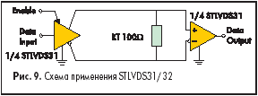 Компания ST рекомендует использовать данные схемы для принтеров, факсов, базовых станций и местных линий беспроводной связи. Эти схемы полностью совместимы с аналогичными схемами DS90LV031A/032A, AM26LS31/2, SN65LVDS31/2 и близки по параметрам к MAX9124/26. Схема их применения показана на рис. 9.