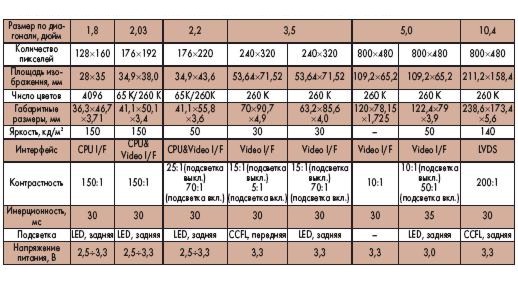 Таблица 5. Основные характеристики ЖК-дисплеев Samsung малых и средних размеров