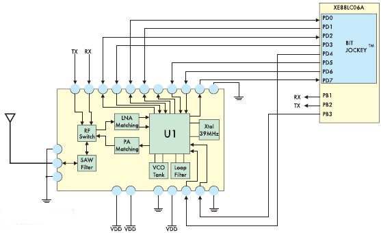 На рис. 3 приведен вариант подключения радиомодуля DP1203 к микроконтроллеру XE88LC06A фирмы XEMICS. На сайте фирмы XEMICS по адресу http://www.xemics.com/docs/xe8000/Api120x.zip можно скачать пакет интерфейсных программ разработчика — API (Application Program Interface), а также его описание и руководство по использованию: http://www.xemics.com/docs/xe8000/tn8000_18_1200_api.pdf. Пакет интерфейсных программ разработчика специально предназначен для работы микроконтроллеров фирмы XEMICS c устройствами на основе трансиверов серии XE1200 и, в частности, DP1203. Пакет включает в себя такие процедуры, как инициализация, прием данных, передача данных и другие. Несмотря на то, что этот программный пакет разрабатывался специально для процессоров XEMICS, исходные коды процедур написаны на языке С и с минимальными изменениями могут быть использованы при работе с микроконтроллерами других фирм.