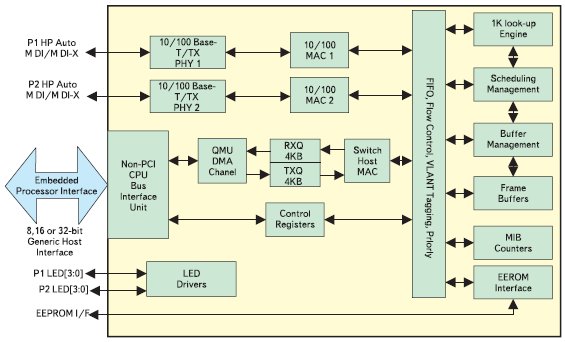 - Коммутатор на 2 Ethernet-порта с переконфигурируемыми шинами для подключения к интерфейсу 8, 16 или 32-разрядного процессора хоста.