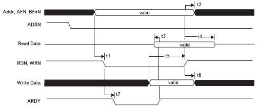 Рис. 7. Диаграмма процедуры асинхронного чтения. Во время цикла обмена данными достоверные значения адреса присутствуют только часть времени цикла обмена. Местное декодирование сигналов адреса
