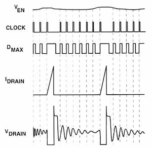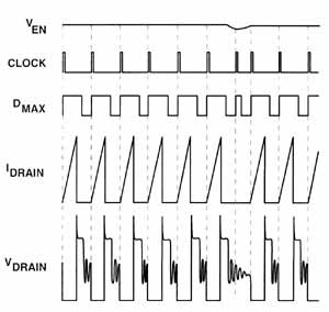 Внутренний таймер TinySwitch работает постоянно. В начале каждого цикла проводится опрос вывода En. Если напряжение на выводе En высокое (I < 40 мкA), коммутация происходит. Если напряжение на En низкое (I > 50 мкA), переключение не производится, а на вывод En снова поступает запрос. При полной загрузке преобразователя контроллер TinySwitch выполняет большинство циклов (рис. 3). При малой нагрузке или холостом ходе почти все циклы будут пропущены (рис.4). Только несколько циклов будет проведено, чтобы компенсировать затраты энергии питания.
