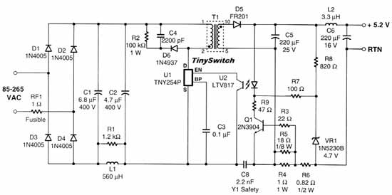 Особенно хорошо TinySwitch подходит для приложений, где требуются стабильные напряжение и ток. В качестве примера приведем принципиальную схему зарядного устройства сотового телефона (U=5,2 В, Р=3,6 Вт), показанную на рис. 6. В устройстве использована микросхема TNY254. На вход через плавкий предохранитель RF1 подается переменное сетевое напряжение 85...265 В. После выпрямления (D1-D4) и фильтрации (С1,С2) высокое постоянное напряжение через первичную обмотку трансформатора Т1 поступает на вывод D TNY254P. Индуктивность L1 совместно с С1 и С2 образуют П-образный фильтр электромагнитных помех. Резистор R1 выполняет роль демпфера. Разделительный конденсатор С8 устраняет гальваническую связь «Вход-Выход». П-образный фильтр, С8 и низкая тактовая частота TNY254 (44 кГц) обеспечивают выполнение требований по ЭМС. Диод D6, емкость С4 и резистор R2 образуют ограничитель, который уменьшает до безопасной величины выбросы напряжения, возникающие на выводе D при закрывании MOSFET.