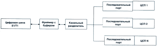 Канальный разделитель ставит в соответствие каждому каналу во фрейме ЦСП, отвечающий за его обработку. Фреймер поставляет эти данные в виде непрерывного цифрового потока, поступающего на последовательные порты каждого ЦСП. Соединение ЦСП с фреймером упрощается благодаря наличию в ЦСП 5000-й платформы (например, в TMS320C5410) встроенных многоканальных буферизированных последовательных портов. Программирование последовательных портов ЦСП на работу с определенной задержкой позволяет ЦСП принимать сигналы от конкретных временных каналов. При этом не требуется дополнительной логики и программ выбора каналов.