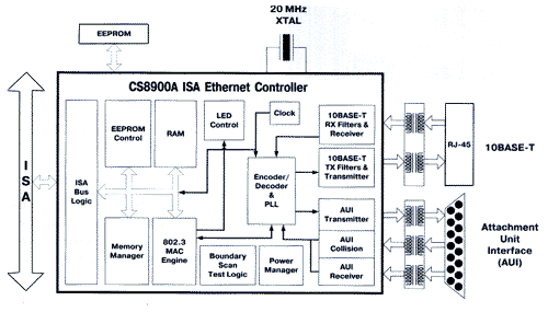 Наибольшее распространение получила микросхема CS8900A (рис. 3) фирмы Crystal Semiconductor, которая фактически представляет собой законченный контроллер Ethernet. Для ее работы требуется минимальное количество внешних компонентов (кварцевый резонатор, сигнальный трансформатор и пять резисторов), при этом выпускается как пяти-, так и трехвольтовая версия микросхемы, что в сочетании с низким энергопотреблением и наличием power-down режимов позволяет применять ее в малогабаритных и малопотребляющих системах. На сайте Crystal Semiconductor можно найти Application Note по подключению данной микросхемы к различным типам микроконтроллеров, а также исходные тексты драйверов для различных операционных систем.