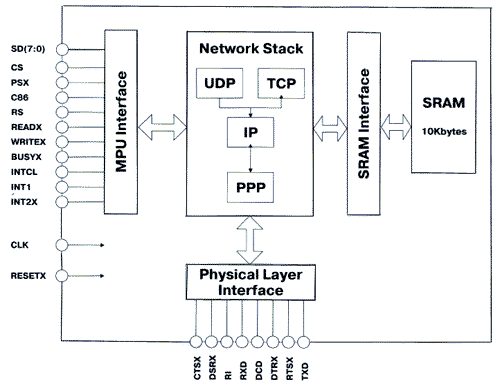 Реализация TCP/IP стека является одной из наиболее сложных задач при подключении микроконтроллеров к Internet. Чтобы облегчить разработку подобных устройств, фирмой Seiko Instruments, Inc. (www.seiko-usa-ecd.com) была выпущена микросхема S7600A (рис. 4), реализующая протоколы PPP, IP, TCP и UDP на аппаратном уровне. Эта микросхема ориентирована в первую очередь на использование в dial-up системах, поэтому для организации физического интерфейса со средой-носителем в ее состав был влючен универсальный асинхронный приемопередатчик.
