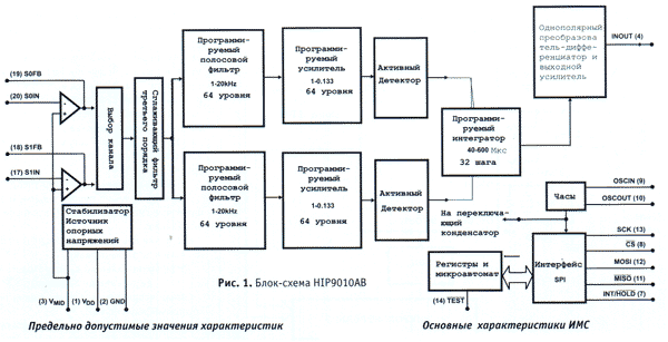 Сигналы датчиков усиливаются входными усилителями и поступают на управляемые полосовые фильтры, снабженные усилителем и детектором. Полоса пропускания каждого фильтра и коэффицент усиления усилителя устанавливаются внешним процессором. После фильтрации и усиления сигналы обоих каналов поступают в программируемый интегратор. С его выхода сигнал преобразовывается в однополярный, усиливается и подается на вывод 4.
