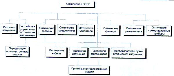 Спектр выпускаемых изделий Ericsson Microelectronics достаточно широк, а применительно к ВОСП он охватывает буквально все ее компоненты. На рисунке 1 представлена обобщенная классификация компонентов ВОСП. Указанные на рисунке передающие оптоэлектронные модули, выполненные в едином конструктивном блоке, включают в себя источник излучения, электронные схемы для стабилизации режимов работы, оптический соединитель или отрезок оптического кабеля. Приемные оптоэлектронные модули содержат фотоприемное устройство, электронные схемы обработки электрического сигнала и стабилизации режимов работы, а также оптический соединитель или отрезок оптического кабеля.