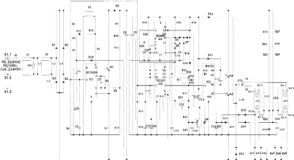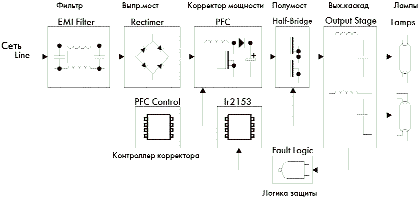 IRPLLNR1 (рис. 1) состоит из узла корректора коэффициента мощности, узла управления балласта, выходного каскада и схемы защиты. Корректор коэффициента мощности выполнен по схеме повышающего конвертора, работающего с переменной частотой и в непрерывном режиме.