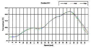 Измеренные данные, записанные на диск, в дальнейшем можно обработать и построить графики в программе Microsoft Excel с помощью специального макроса, входящего в комплект. На рис. 6 показан такой график температурного профиля печатной платы при ее прохождении через нагревательную камеру конвейерной печи, полученный измерением в трех точках.