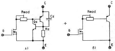 Причиной защелкивания IGBT транзисторов является наличие триггерной структуры, образованной биполярной частью IGBT и паразитным NPN транзистором. Эквивалентная схема, учитывающая подобный эффект, показана на рис. 1, а. Такую эквивалентную схему приводили в своей документации многие фирмы, в частности Siemens, Toshiba, Fuji и другие.