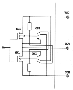 Механизм возникновения защелки в драйверах несколько иной, чем это показано выше. На рис. 2 показан типичный выходной каскад драйвера, образованный комплиментарной парой КМОП-транзисторов MP1 и MN1. В схеме также присутствуют паразитные биполярные двухколлекторые транзисторы OP1, ON1, OP2, ON2, связанные с активными КМОП-транзисторами и их внутренними диодами. Именно эти биполярные транзисторы и формируют триггерную PNPN-структуру, приводящую к защелкиванию.