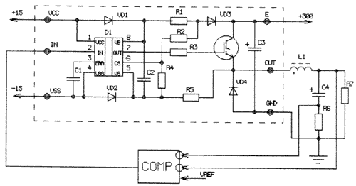 Схема, приведенная на рис. 5, представляет собой ШИМ-регулятор напряжения. Выход компаратора COMP управляет входом драйвера. На его инвертирующие входы подаются сигналы обратной связи с выхода регулятора и с резистора R6, измеряющего ток заряда конденсатора сглаживающего фильтра. Сигналы обратной связи сравниваются с опорным напряжением Uref. Таким образом, на нагрузке поддерживается постоянное напряжение, а зарядные токи конденсатора не приводят к срабатыванию защиты. Питание схемы производится от выпрямленного сетевого напряжения 220 В. Ток, потребляемый нагрузкой R7, не превышает 10 А.