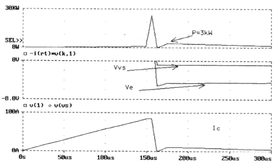 На нижней эпюре показан ток коллектора транзистора Ic, начиная c момента включения, когда напряжение на нагрузке нулевое. Он нарастает до величины, ограниченной обратной связью (около 80 А), после чего драйвер стремится отключить силовой транзистор. Однако из-за индуктивного характера нагрузки при запирании транзистора открывается диод VD4, ток которого в первый момент имеет такую же величину. Прямое падение напряжения на диоде при таком токе составляет около 5 В, то есть напряжение на эмиттере транзистора (Ve) в этот момент — минус 5 В. Между тем, потенциал на выходе драйвера такой же, как на выводе VS (Vvs). Его величина ограничена диодом VD2 и не превышает 0,7 В. Поэтому транзистор оказывается приоткрыт и ток через него не прекращается! Это видно из графика Ic. Транзистор выходит из насыщения, и мощность, рассеиваемая на нем (около 3 кВт), может привести к разрушению кристалла. Как правило, после выхода из строя транзистора повреждается и драйвер. Исключение из схемы диода VD2 устраняет эту проблему, однако появляется вероятность повреждения драйвера из-за отрицательных пиков. Показанный процесс можно назвать схемотехнической защелкой, в отличие от защелки технологической.