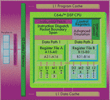 Семейство TMS320C64x будет превосходить существующие семейства 'С62x и 'C67x по всем параметрам. Усредненное быстродействие ЦПУ будет почти в 10 раз выше, чем у TMS320C6201. Для достижения таких характеристик была использована VLIW-архитектура VelociTI.2TM (рис. 2). Был удвоен объем регистровых файлов в каждом из блоков исполнения, а сами исполнительные устройства расширены и построены по схеме с блочным расщеплением. Например, если в 'C62x устройство М могло выполнять в одном такте умножение 16х16 разрядов, то в 'C64x оно может умножать 32х32 разряда и получать 64-разрядный результат, либо выполнять два умножения 16х16 и получать два 32-разрядных результата, либо — 4 умножения 8х8 с получением четырех 16-разрядых результатов.