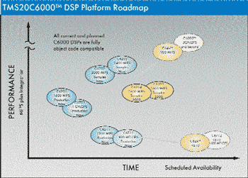 Важным вкладом в повышение быстродействия нового семейства является использование суб-0,1-микронной технологии при производстве кристаллов. Кремний будет выпускаться с технологическими нормами 0,09 мкм, что позволит при тактовой частоте 1,1 ГГц иметь производительность 8800 MIPS, либо 4400 16-разрядных MMACs (млн умножений с накоплением в секунду), либо 8800 8-разрядных MMACs. Интересно, что при такой частоте удается сохранить невысокую мощность рассеивания, в пределах 4 Вт, что выгодно отличает ЦСП семейства 'C64x от быстродействующих процессоров других производителей.
