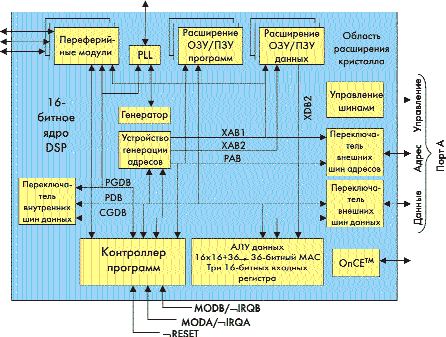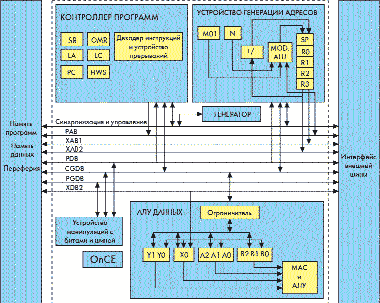 Микропроцессоры данного семейства являются полностью 16-разрядными с длиной команд процессора в 16 бит, что обусловливает их несовместимость с другими семействами. Обобщенная структурная схема процессора семейства DSP568xx представлена на рис. 1.