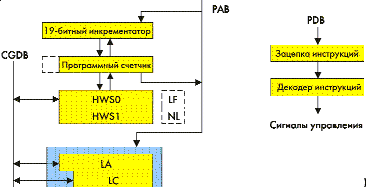 Программный контроллер предназначен для выполнения предвыборки и декодирования инструкций, управления аппаратными циклами и обработки прерываний. Структурная схема программного контроллера представлена на рис. 5.