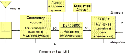 Например, сигнальный процессор выполняет операции голосового кодирования и декодирования, управление протоколами и предварительную коррекцию ошибок. DSP-56800 с производительностью 20 MIPS может выполнять также функции модуляции и демодуляции, если это необходимо. Эффективные конструктивные решения семейства DSP56800 снижают энергопотребление.