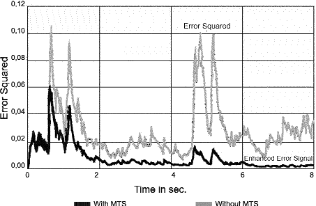 Гибридная система «САГ — аудио» использует метод подавления интерференции музыкальных сигналов, позволяющий исключить аудиосигнал из сигнала датчика ошибки гашения. Это требует применения специальных LMS-алгоритмов настройки фильтров, позволяющих точно оценить уровень аудиосигнала на выходе датчика ошибки. Необходимо, чтобы метод подавления интерференции позволял адаптивно распознавать музыкальные составляющие и выделять их из сигнала ошибки гашения. Без использования метода подавления интерференции время сходимости LMS алгоритма значительно увеличивается, и снижение внешнего шума невелико. Применение метода позволяет не только повысить на 3–5 дБ эффективность гашения, но и сократить время сходимости алгоритма (рис. 9).
