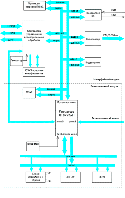 Вычислительный модуль служит для инициализации системы обработки изображения при включении питания, задания режимов работы по командам, полученным по последовательному каналу RS-232, а также настройки и калибровки системы. В зависимости от установленного режима (минимальной или покадровой задержки) изменяется состав выполняемых процессором функций обработки изображения. В режиме минимальной задержки процессор готовит для интерфейсного модуля значения уровня серого и коэффициента передачи для следующего кадра (по данным текущего кадра) и загружает их в память ИМ. Дополнительной задержки на обработку изображения при этом не вносится. В режиме покадровой задержки процессор, кроме перечисленного выше, занимается также при необходимости накоплением кадров, расцвечивает в условные цвета или для черно-белого изображения кодирует в условных тонах изображение и только затем пересылает данные в видеопамять. При этом задержка составляет 40 мс.