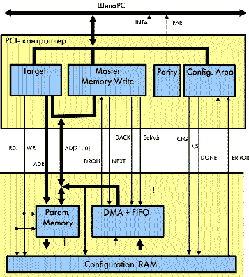 PCI-контроллер размещается на кристалле EPM7256A фирмы ALTERA, в малогабаритном корпусе TQFP-144 с питанием от +3,3В. Он рассчитан на 32-битную шину данных и частоту 33 МГц. Допускает подключение как к +3,3В шине PCI, так и к +5В. После проведения стандартных операций Plug-and-Play контроллер способен производить загрузку файлов конфигурации в ПЛИС серии фирмы ALTERA. Статические сигналы для проведения загрузки (nCFG, DONE, nERROR) отображаются на резервные биты командного слова и слова состояния в служебной зоне PCI-контроллера (Config. Area). Загрузка производится по параллельной пассивной асинхронной схеме (PPA), по тем же линиям (AD[7..0], RD, WR), которые после загрузки будут участвовать в передаче данных между основной ПЛИС и контроллером. Требуется специальный программный драйвер, который производит загрузку файла с винчестера в конфигурационную память ПЛИС (Configuration RAM).