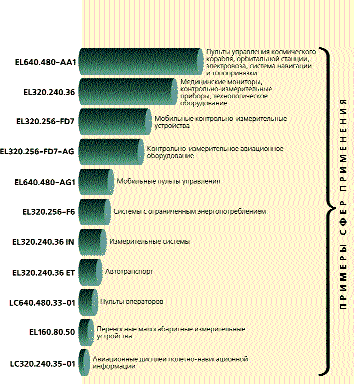 Лидером по применениям среди ЭЛ-дисплеев является EL640.480 АА1. Отличные функциональные и эксплуатационные параметры этой модели делают ее пригодной для самых критичных применений, от космического аппарата до подводной лодки, от стационарных промышленных систем до электровозов и самолетов.
