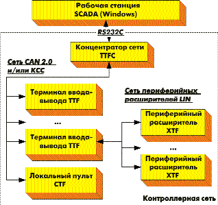 Обобщенная структура КТС «БРИЗ» представлена на рис. 1. Система включает до 127 контроллеров семейства TTF, в том числе терминалы ввода/вывода TTF, концентратор сети TTF C, локальный пульт оператора CTF. Число каналов ввода-вывода может быть увеличено подключением к контроллерам периферийных расширителей XTF. Для связи концентратора сети с ПК используется гальванически изолированный интерфейс RS-232C.