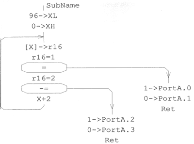 Поскольку основная масса условных и безусловных переходов вводится и отображаются графически, то программа освобождается от бесчисленных имен меток, которые в ассемблере являются неизбежным балластом, загромождающим текст программы. Необходимость имен для меток остается только для входов в подпрограммы.