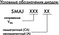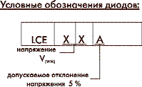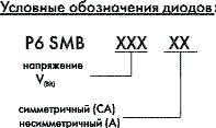 Диоды серии P6КЕ6,8–P6КЕ440СА выпускаются в симметричном и несимметричном исполнении. В обозначении симметричного диода добавляется суффикс С или СА.