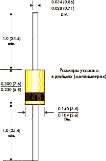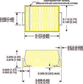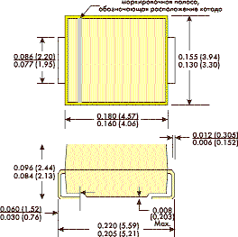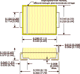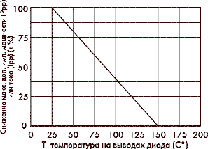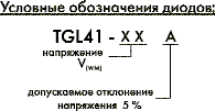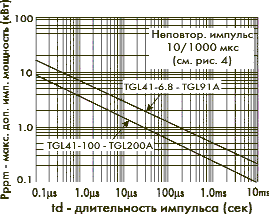 Диоды этой серии выпускаются в оригинальных цилиндрических корпусах для поверхностного монтажа. Они выпускаются только в несимметричном исполнении. Для обозначения катода на корпусе наносится специальная полоса голубого цвета (см. габаритный чертеж TGL41-6.8–TGL41-200A ). График, иллюстрирующий зависимость Ppp или Ipp от T для диодов серии TGL41-6.8– TGL41-200A аналогичен приведенному на рис. 15 графику для диодов серии P6КЕ6,8– P6КЕ440СА.