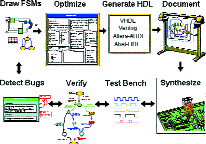 Компилируемый VHDL может как моделироваться, так и синтезироваться для реализации на ПЛИС. Если проект был выполнен в StateCAD, поведенческая верификация осуществляется с использованием StateBench. StateBench позволяет провести пошаговую проверку цифрового автомата. На рис. 1 приведен типичный процесс разработки цифрового автомата в пакете StateCAD.