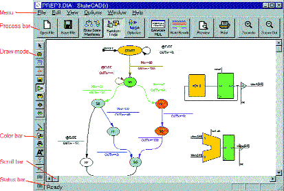 StateCAD использует фиксированную цветовую схему. Область рисования окна диаграмм состояний всегда белого цвета, выбранные объекты всегда красного цвета, а невыбранные объекты отображаются на экране в цветах, заданных пользователем. Нельзя открывать одновременно несколько окон в StateCAD. Окно диаграмм состояний StateCAD представлено на рис. 2.