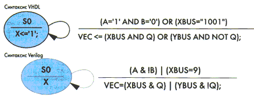 Операторы VHDL/VERILOG в StateCAD могут быть использованы для определения ряда логических условий. Подмножество стандартных операторов VHDL 1076 (и OVI Verilog) может использоваться в условиях и выходных данных, позволяя вводить диаграмму состояний таким образом, что используется логика языков VHDL, Verilog или ABEL — HDL. При этом форматы ABEL — HDL, Altera–HDL, Verilog, и VHDL могут быть скомбинированны. Поддерживаются VHDL операторы назначения сигналов BIT <= '1'; or BIT <='0'; or BUS <= «10...1»; or BUS <= constant; операторы Verilog &, |,!, и оператор = для назначения. Поддерживаемые операции для условий — операторы равенства (=, / =, <, <. =, >, > =), логические операторы (И, ИЛИ, НЕ) и двоичные константы (только 1 и 0). Поддерживается битовое и векторное сравнение.