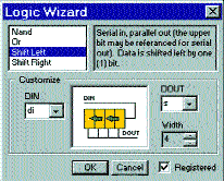 Мастер логики (Logic Wizard) упрощает разработку логики обработки потоков данных. Он позволяет выбрать потоковые логические шаблоны и имена сигналов. В результате выбора формируются соответствующие уравнения, создаются определения портов, определяются управляющие сигналы. Логический мастер поддерживает счетчики, мультиплексоры, сдвигающие устройства, защелки и ряд других. Окно мастера логики представлено на рис. 7.