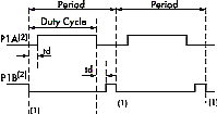 Пример построения полумостовой схемы приведен на рис. 5. При управлении силовыми ключами полумостовой схемы может возникнуть ситуация, когда один ключ еще не успел закрыться, а второй уже открылся. В этом случае через эти оба открытых ключа от источника питания на землю потечет сквозной ток, что приведет к выходу их из строя. Для того чтобы этого не произошло, смена активных состояний сигналов P1A и P1B происходит через промежуток времени td, в течение которого оба сигнала неактивны. Это гарантирует уверенное запирание первого ключа к тому моменту, когда начнет открываться второй ключ. В модуле ECCP предусмотрен специальный регистр P1DEL, с помощью которого можно задавать время задержки td, таким образом предотвращая появление сквозных токов.