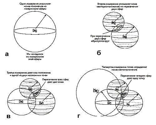 В этом случае спутники являются пунктами с известными координатами. Предположим, что расстояние от одного спутника известно, и вокруг него можно описать сферу заданного радиуса. Если известно также расстояние до второго спутника, то определяемое местоположение будет расположено где-то в круге, задаваемом пересечением двух сфер. Третий спутник определяет две точки на окружности. Четвертый спутник позволяет окончательно точно определить местоположение точки. Таким образом, зная расстояние до четырех спутников, можно вычислить координаты определяемой точки (рис. 1).