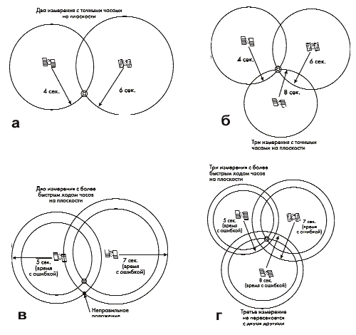 Как видно из вышесказанного, вычисления напрямую зависят от точности хода часов на спутниках и в приемниках. Код должен генерироваться на спутнике и в приемнике строго в одно и то же время. На спутниках установлены атомные часы, имеющие точность около одной наносекунды. Однако это решение является слишком дорогим, чтобы использовать его в приемниках GPS. Поэтому для устранения ошибок хода часов приемника используются результаты измерения сигналов от четвертого спутника. Их можно использовать для устранения ошибок, которые возникают, если часы на спутнике и в приемнике не синхронизированы. Рисунок 2 наглядно это показывает.